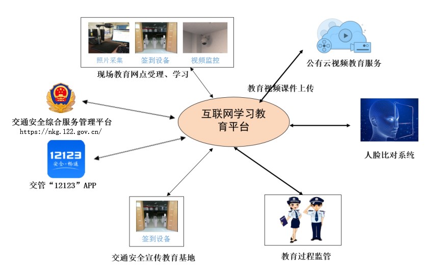 駕駛人在申請滿分/審驗學習后,在現(xiàn)場教育過程中,通過人行通道閘設備進行人臉比對操作,每次簽到或簽退操作都需要進行人臉比對確認本人,比對成功后將信息寫入互聯(lián)網交通安全綜合服務管理平臺。整個教育完成后,簽到簽退數據、監(jiān)控數據等信息交換到綜合應用平臺并辦理相關業(yè)務。
